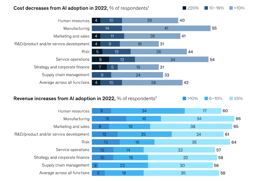 La mayorĂa de los encuestados informaron aumentos en los ingresos relacionados con la IA en cada funciĂłn comercial que utiliza la IA.