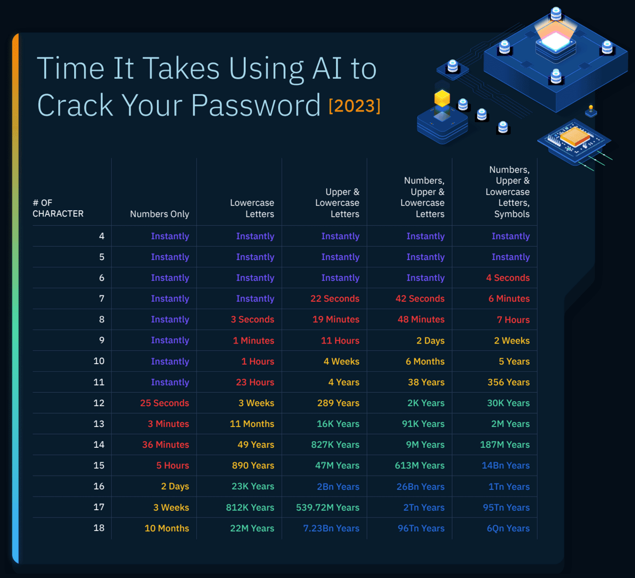AquĂ abajo os dejamos una tabla del tiempo que se tarda, usando IA, en descifrar una contraseĂąa dependiendo del nĂşmero y el tipo de carĂĄcteres.