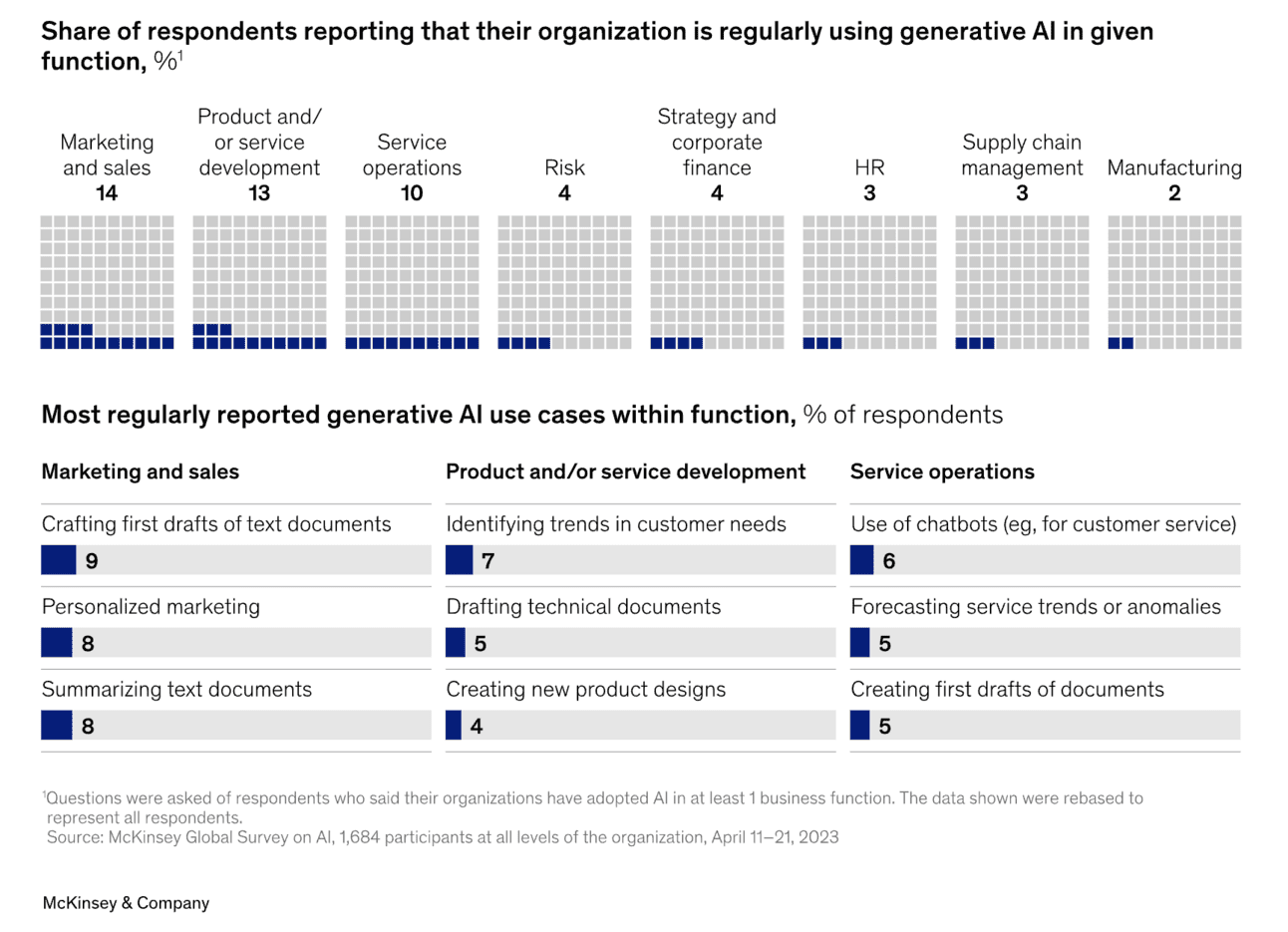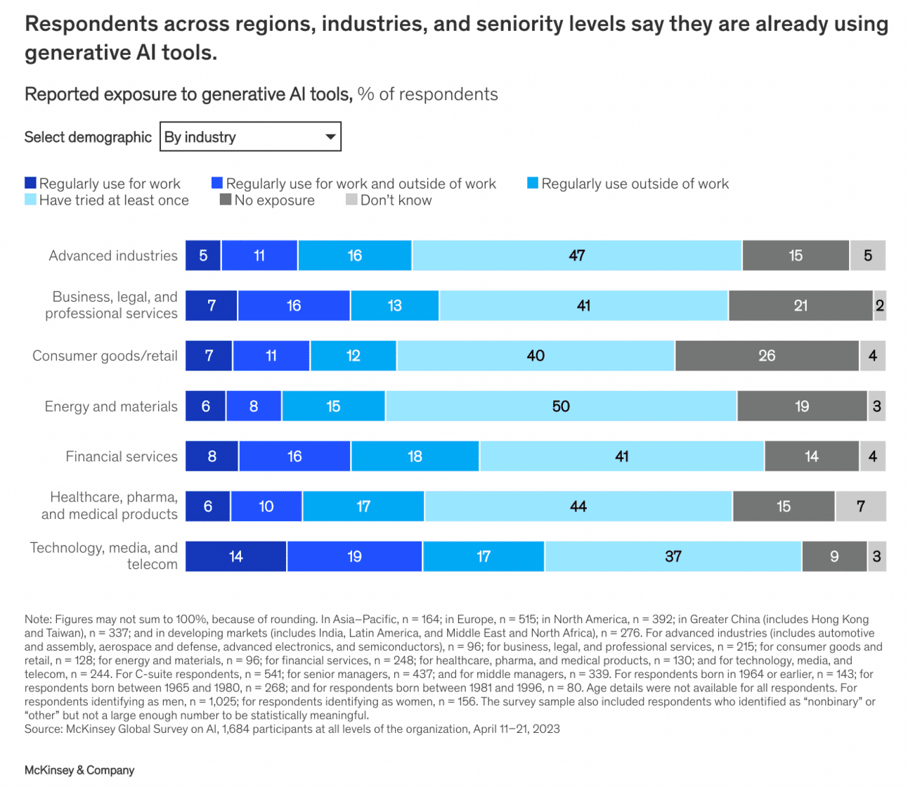 La semana pasada, McKinsey publicĂł un informe bien detallado sobre el estado de la IA en 2023. Entre una larga lista de ideas, el informe comenta que casi un tercio de los trabajadores estĂĄ utilizando IA en el trabajo regularmente.