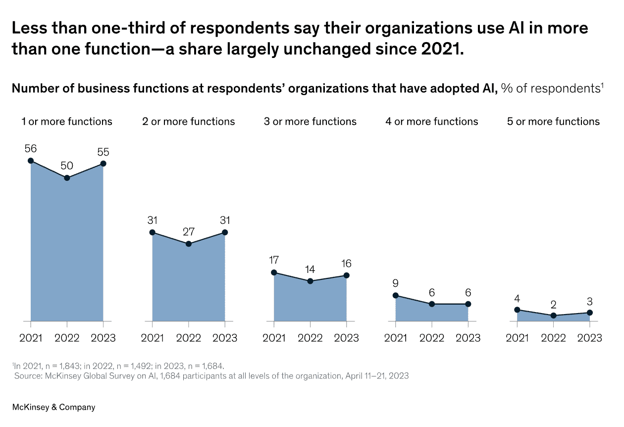 A pesar de la rĂĄpida propagaciĂłn de la IA generativa, la adopciĂłn general de la IA se mantiene constante en un 55%. El uso estĂĄ limitado en alcance, con solo un 23% diciendo que utilizan la IA generativa en mĂĄs de una funciĂłn comercial, lo que sugiere que el uso de la IA no estĂĄ experimentando un aumento drĂĄstico dentro de la mayorĂa de las organizaciones.