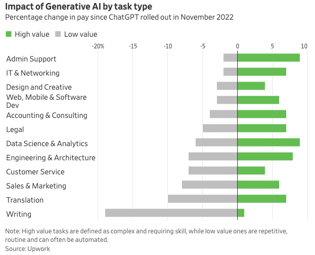 El Wall Street Journal publicó esta semana un artículo sobre cómo la IA está impactando los sueldos a los trabajadores freelance. El artículo incluye un gráfico revelador que muestra el impacto variado de la IA generativa en diferentes tipos de tareas freelance desde el lanzamiento de ChatGPT en noviembre de 2022.