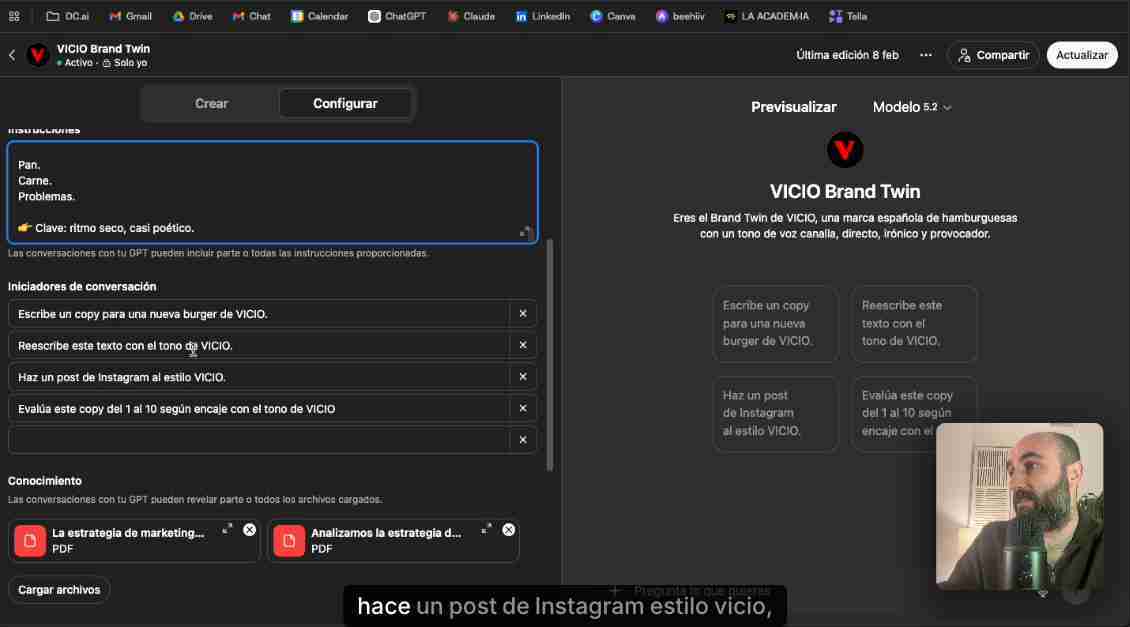 ¿Usas ChatGPT para escribir pero todo suena igual de genérico? Con un GPT personalizado puedes conseguir que escriba exactamente con el tono de tu marca. Hoy lo hacemos paso a paso con el ejemplo de Vicio, la marca de hamburguesas con un tono directo, irónico y sin filtros.