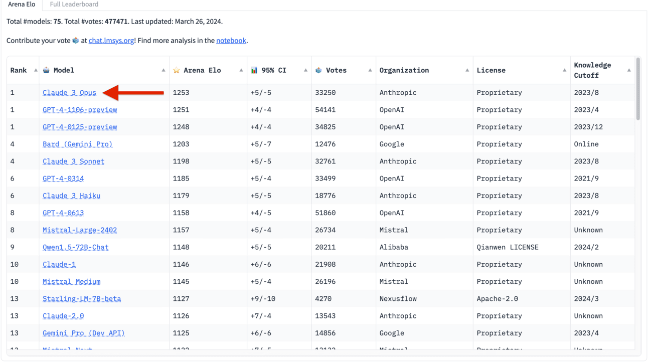 El modelo Claude 3 Opus de Anthropic ha superado por primera vez a GPT-4 en la tabla de clasificación de LMSYS Chatbot Arena.