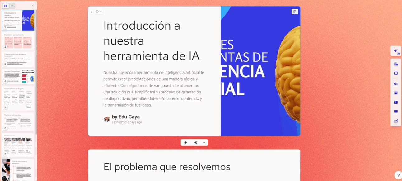 Es muy probable que no te dé la presentación de principio a fin exactamente como la quieres, pero va a ser muy útil para no enfrentarte al folio el blanco y seguro que te aportarÔ mucho contenido de valor escrito (en el caso que empieces desde un prompt).