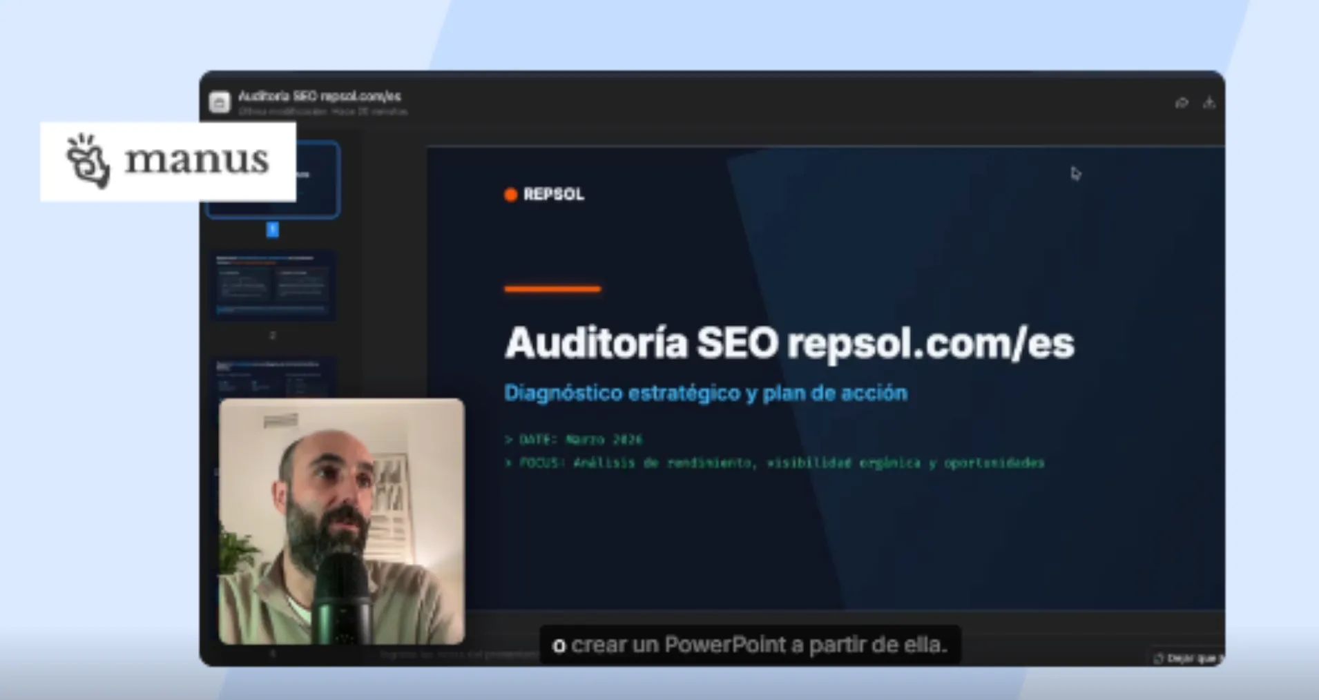 Una URL, tres prompts y cualquier LLM es todo lo que necesitas para tener una auditoría SEO completa, una presentación ejecutiva y un workbook listo para ejecutar. Nosotros lo hemos hecho con Manus, pero tú puedes elegir el asistente que más te guste. Te lo enseñamos paso a paso en este tutorial.