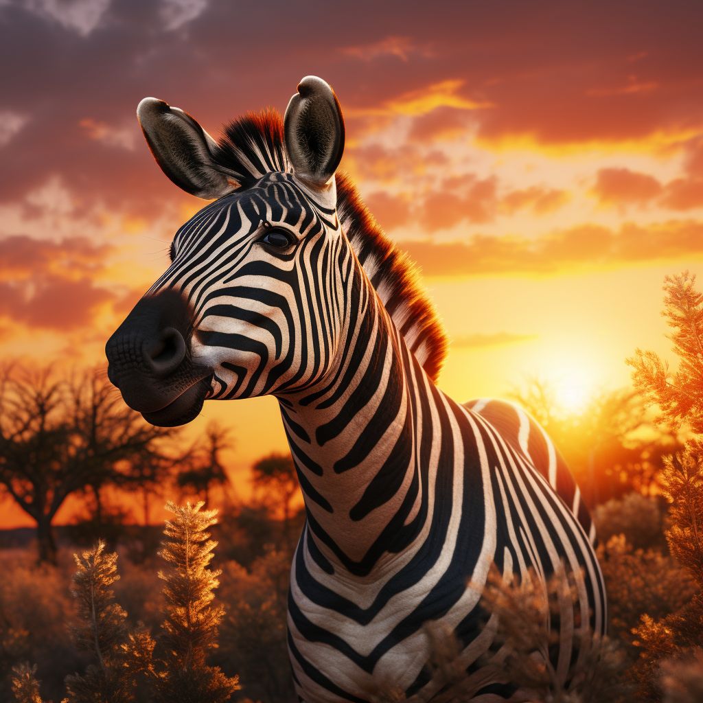 Create a realistic photo of a zebra in a beautiful sunset. Use an 8K professional camera