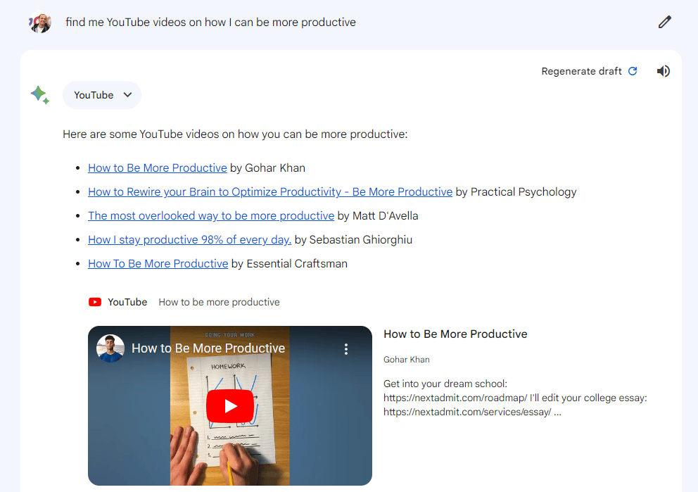 2.- Pídele que encuentre videos por tí: Si estás buscando videos de como ser más productivo, le puedes pedir a Bard que los encuentre por ti. Una vez los tenga le puedes pedir lo que sea sobre esos videos, por ejemplo, que te extraiga los 3 puntos clave del video.
