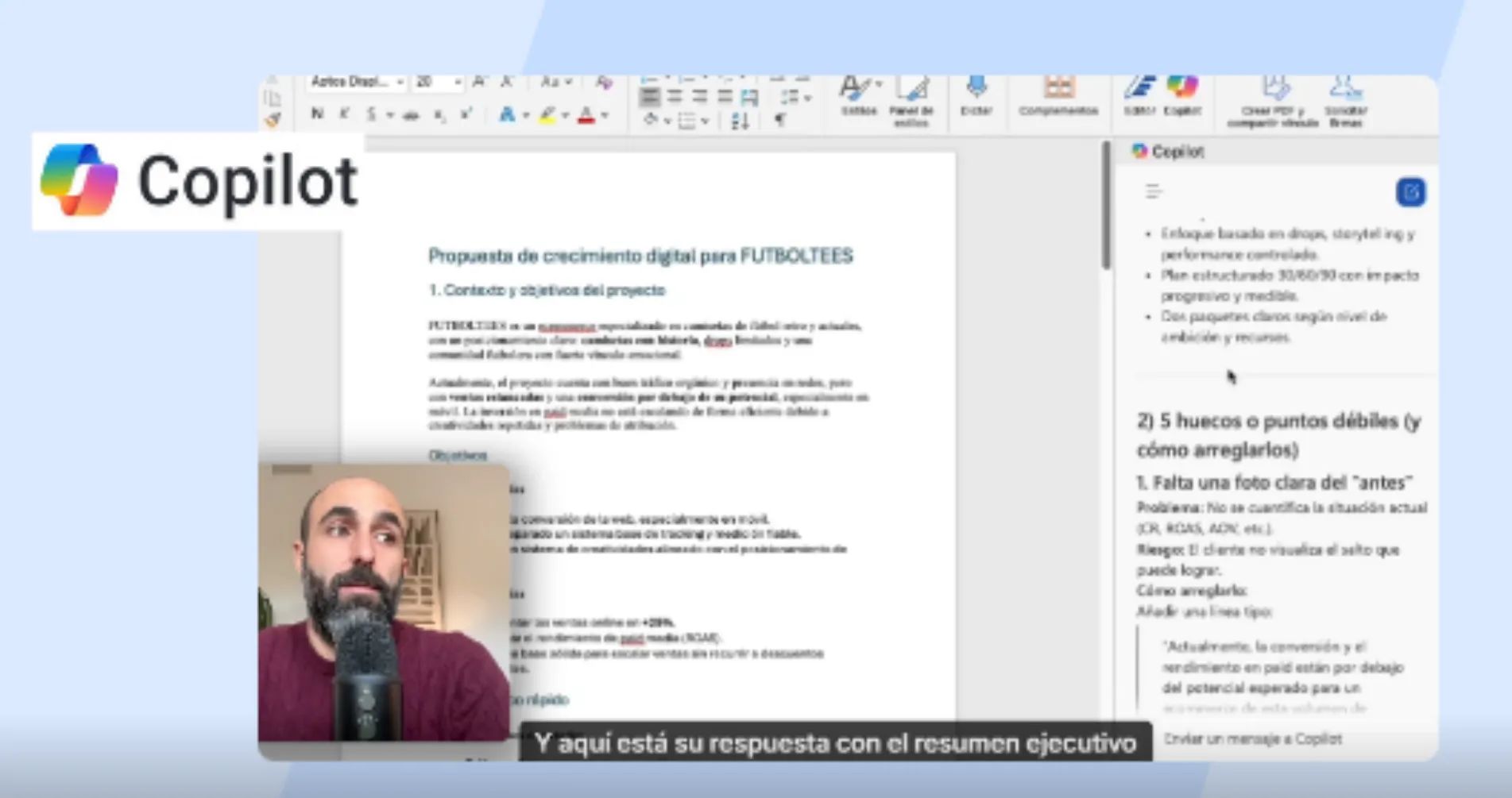 3️⃣ Usa Copilot como revisor: resumen ejecutivo, huecos del texto y posibles objeciones de tu audiencia.