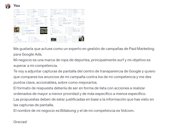 El nombre de mi negocio es [nombre de negocio] y el de la competencia [nombre del negocio]Así es como quedaría el prompt en ChatGPT con los 2 pantallazos adjuntos: