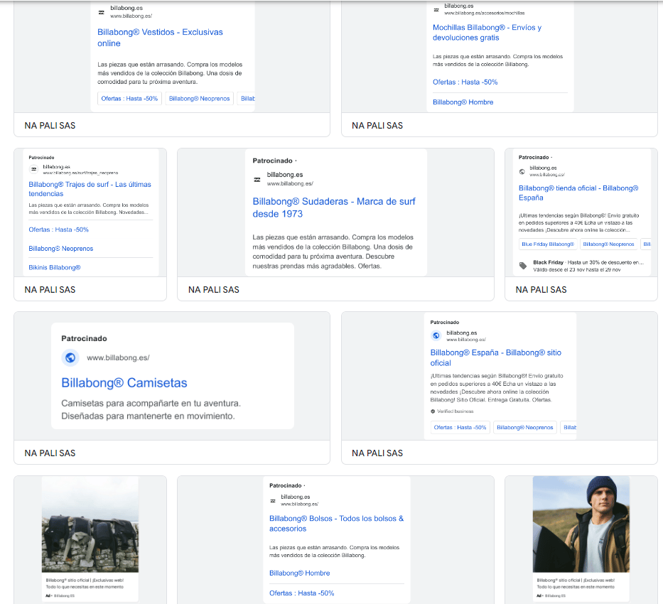 Ponemos nuestra URL (https://www.billabong.es/) y sacamos un pantallazo de los anuncios que nos aparecen.