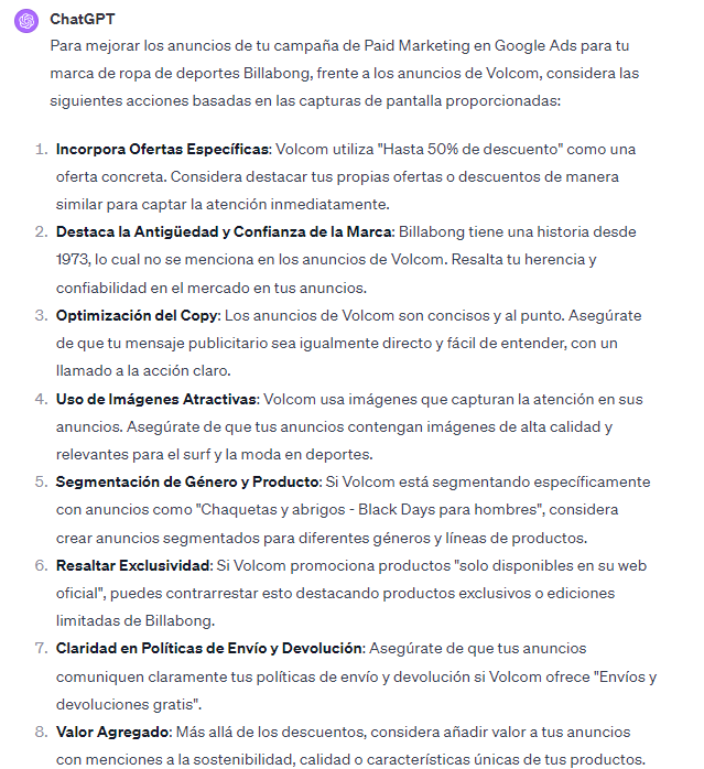 Como véis, en tan sólo 1 minuto hemos podido obtener un listado de consejos muy valiosos de cmo podemos mejorar nuestras campañas de pago y poder superar a nuestra competencia.