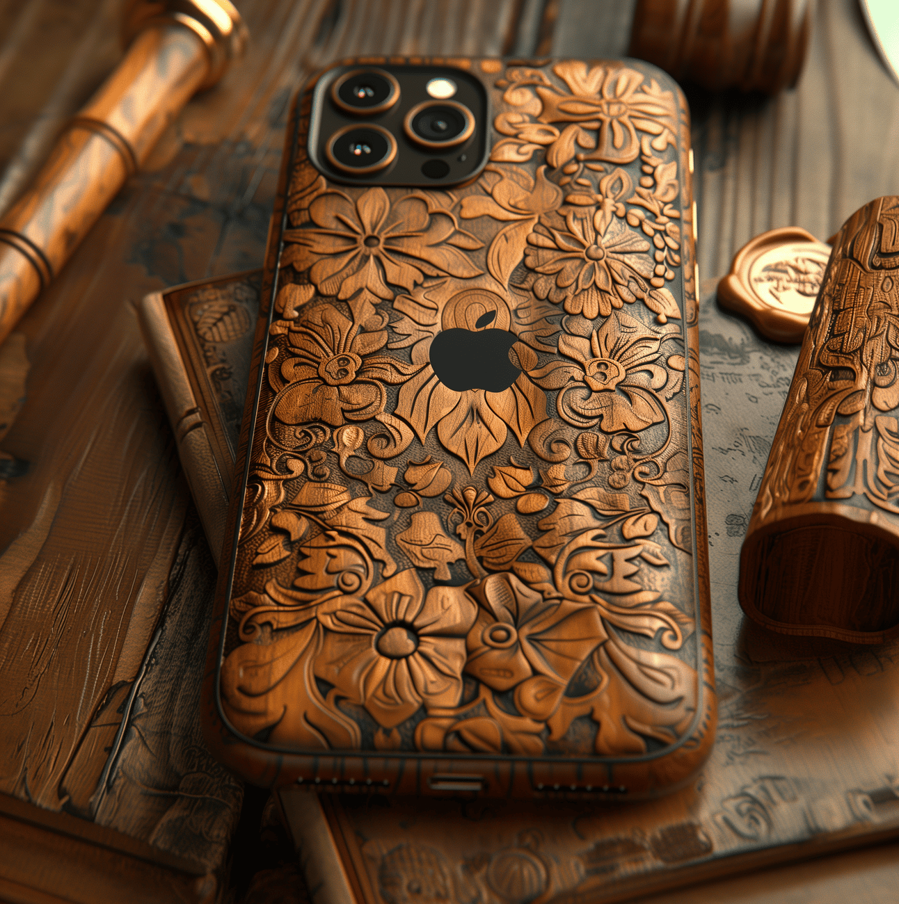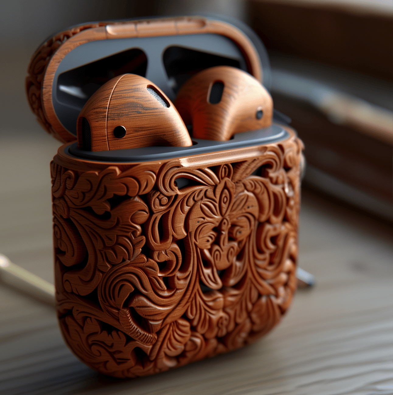 Ilustración hiperrealista de unos AirPods de madera de la era renacentista y su estuche, con detalles de tallado en madera. El estuche está abierto con los auriculares dentro, sobre un escritorio de madera. La escena está iluminada con una luz suave y cálida, con tonos en marrón, y una ambientación de estudio del siglo XV con detalles al estilo de Leonardo da Vinci. La imagen es de alta definición, 8k de resolución --chaos 75 --ar 4:5 --stylize 1000 Tras generar la primera imagen, copiamos el estilo a los prompts restantes utilizando el parámetro --sref y añadiendo la url de la imagen. Si no sabes o no recuerdas como utilizar el parámetro --sref, en esta edición te lo explicamos.