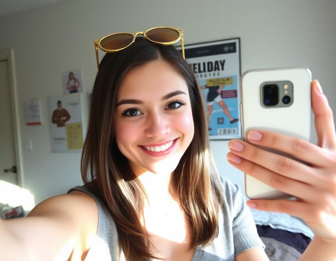 A young woman taking a selfie with her phone typical of a 2015 snapchat post. She is smiling casually, with minimal makeup, in a casual setting like her bedroom. The lighting is soft and natural, coming from a window, with posters and a bed in the background.Nota: Hemos probado el modelo en español e inglés y por ahora podemos decir que funciona mejor en Inglés.