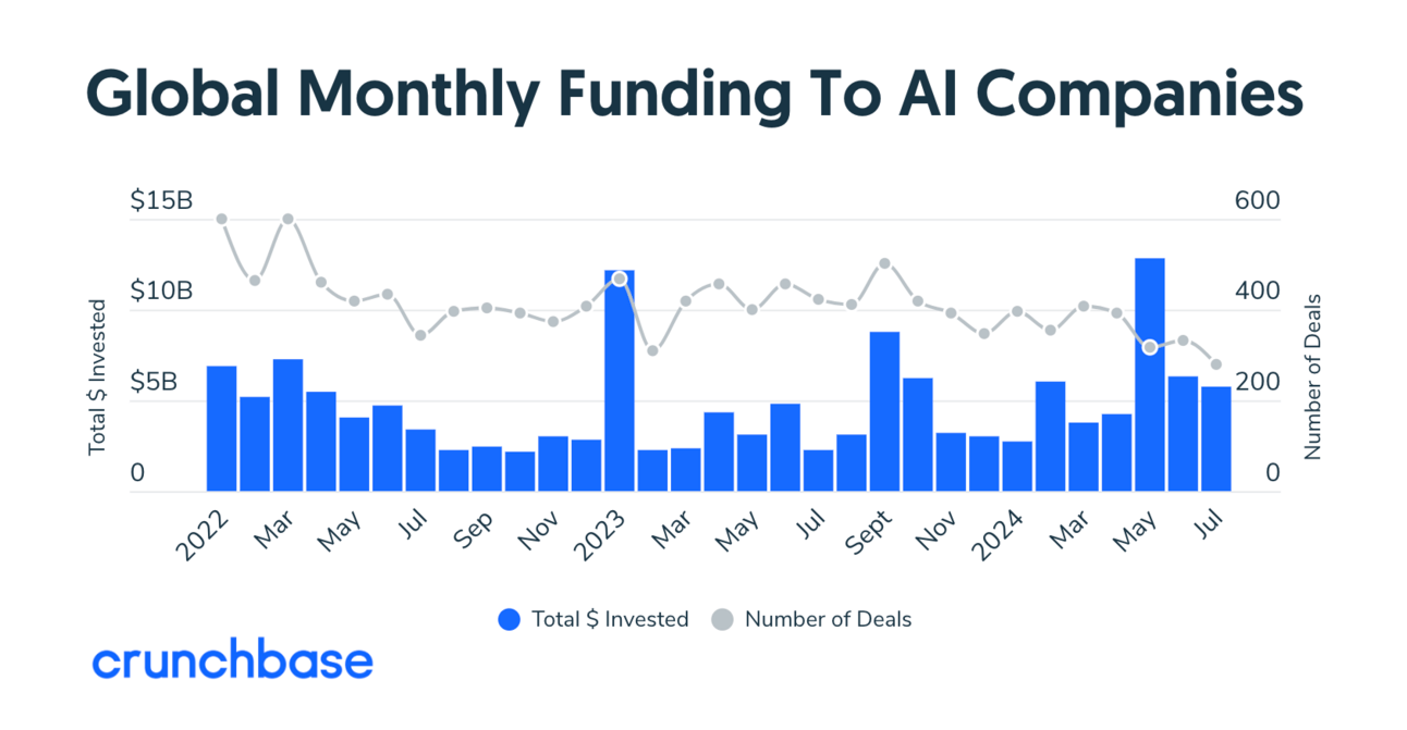 Según los últimos datos de Crunchbase, las empresas de IA captaron aproximadamente una cuarta parte de los 23.000 millones de dólares de financiación total en julio, unos 5.800 millones, solo superadas por las empresas de salud y biotecnología. Aunque estas cifras representan un ligero descenso respecto a meses anteriores, la tendencia general sigue siendo alcista.