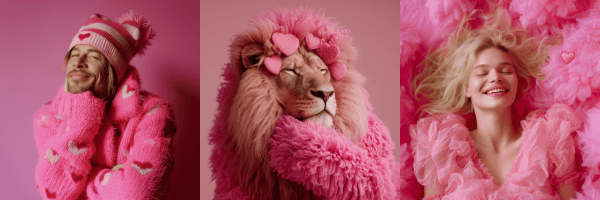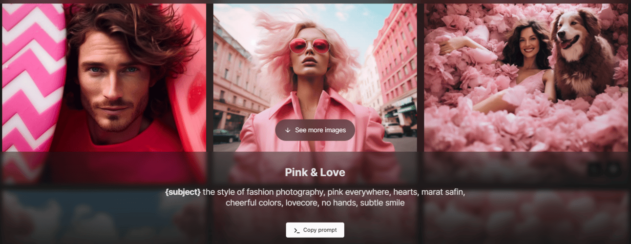 /imagine {subject} the style of fashion photography, pink everywhere, hearts, marat safin, cheerful colors, lovecore, no hands, subtle smile Y aquí algunas de las creaciones que hemos podido ralizar en segundos con este prompt.