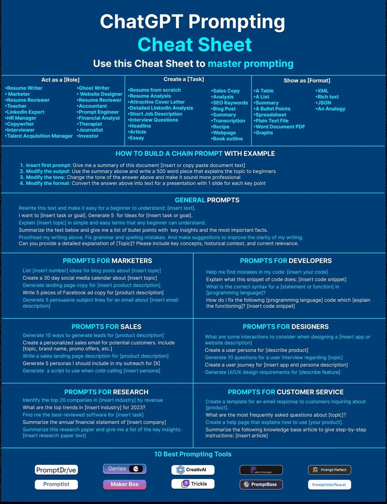 En el tutorial de esta semana os dejamos un “Cheat sheet” que hemos encontrado que nos parece super útil y que ilustra muy bien como promptear en ChatGPT.