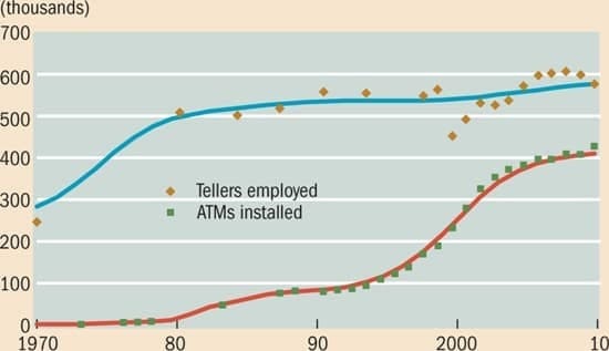 Para un ejemplo más reciente, echa un vistazo a lo que sucedió con los cajeros automáticos y los empleados de banco. Los empleados de banco en los años 80 y 90 tendrían todas las razones para creer que los cajeros automáticos podrían hacerlos obsoletos al asumir la parte más importante de su trabajo: contar y dispensar efectivo. Pero los datos muestran lo contrario: