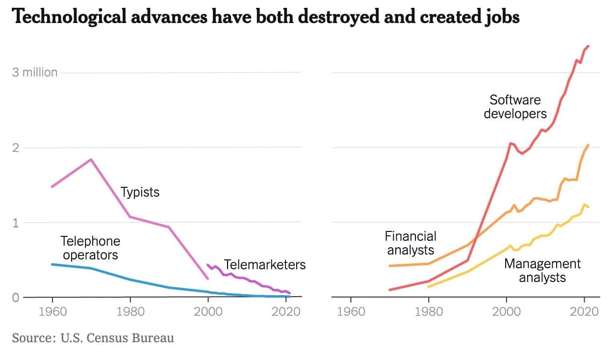 A medida que algunas categorías de trabajos desaparecen, surgen nuevos para llenar el vacío. Un estudio del economista del M.I.T. David Autor revela la naturaleza dinámica del mercado laboral: un sorprendente 60% de los trabajos que existían en 2018 no existían en 1940.