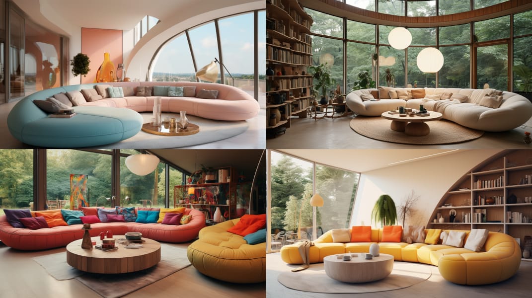 Imagina que eres un diseñador de interiores y quieres sacar ideas para una sala de estar con un sofá gigagante y redondeado. Haremos 2 creaciones utilizando el siguiente prompt, una con parámetro chaos 0 y la otra con parametro chaos 100 para ver las diferencias.